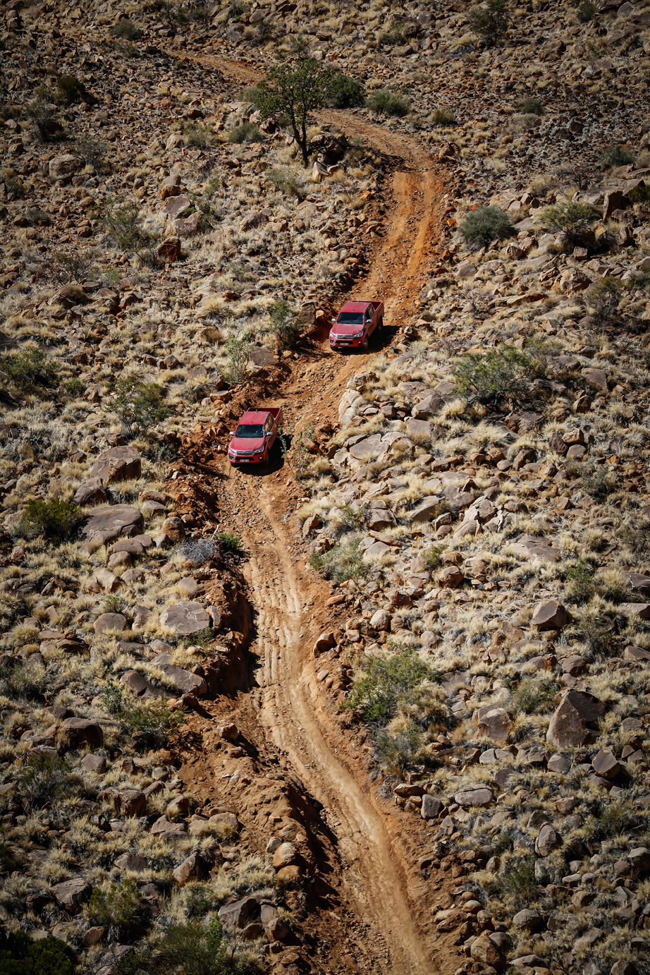 Dass sich die teils imposanten, teils putzigen Tierchen nicht an Verkehrsregeln halten, kann man ihnen nicht vorwerfen. Da quert schon einmal direkt vor der Motorhaube eine Springbock-Familie den Weg. Kurz darauf stakst zwischen Dornbüschen und Schirmakazien eine Giraffe daher. Praktisch, bei der Hilux-Doppelkabine eine 1,55 Meter lange und 1,54 Meter breite Ladefläche hinter sich zu wissen, die in solchen Fällen als ideale Aussichtsplattform dient. Wer indes ernsthaften Ladebedarf hat, kann hier und im restlichen Hilux bis zu 1.100 Kilo verstauen. Ein großes Zelt, Wasser, Lebensmittel, Reserve-Sprit und ein paar Dosen Windhoek Lager gehen so bequem und ohne Platzangst auf den nächsten Trip in die südwestlich von Windhuk liegenden Hakosberge, wo abseits der Straßen ein rustikaler Bergpfad auf den Hilux wartet. Eine ideale Gelegenheit für den Pick-up, zu zeigen, dass er trotz unzähliger elektronischer Beigaben noch immer ein ernsthafter Geländegänger ist. Die hintere Starrachse samt Blattfedern ist die Basis, der zuschaltbare Allradantrieb inklusive Geländeuntersetzung und Sperre hinten der Garant für souveräne Offroad-Kompetenz. Onroad, also auf den namibischen Schotter- und Sandstraßen, zeigt der Hilux hingegen, dass er nicht nur ein Arbeitstier ist, sondern auch lange Reisestrecken beherrscht. Lässig, ohne Aufwanktendenzen, steckt das Fahrwerk kleinere und größere Schlaglöcher weg, Kraft ist in jedem Drehzahlbereich dank des neuen, 150 PS starken Vier-Zylinder-Turbodieselmotors samt Direkteinspritzung immer vorhanden. Ideal in Verbindung mit der ebenfalls neuen 6-Gang-Automatik, nur wer öfter ins Gelände muss, greift zum manuellen 6-Gang-Getriebe. Sparsam sind indes beide Varianten (6,8 Liter Normverbrauch mit Handschalter, 7,2 Liter mit Automatik), was nicht zuletzt der optionalen Start-Stopp-Automatik zu verdanken ist.